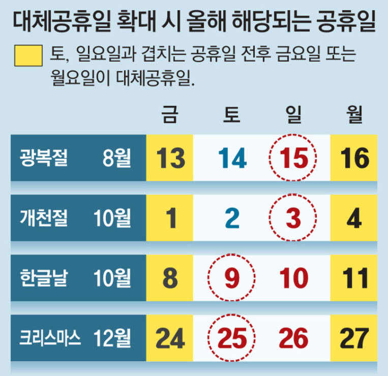 속보 대체공휴일 늘어난다···올 광복절부터 모든 공휴일에 적용.